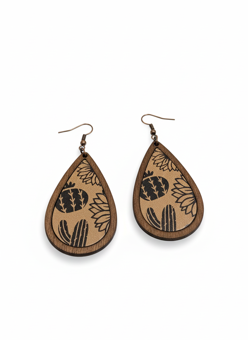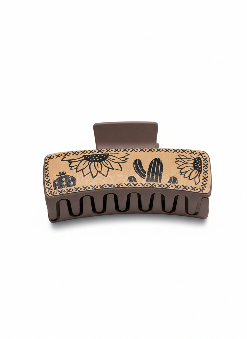 Add a touch of the outdoors to your look with this Sunflower & Cactus Hair Claw Clip. The oversized design, featuring etched desert-inspired flora on a tan base, is ideal for securing thick hair. Perfect for embracing a Western, Boho, or Farmhouse Chic aesthetic. This stylish clip makes a unique, trendy statement, whether you're at a festival or just running errands.