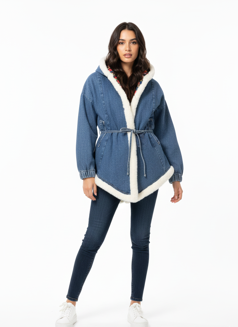 This stylish and comfortable parka offers a charming blend of casual denim with warm, feminine details, making it the perfect piece for transitional weather.
