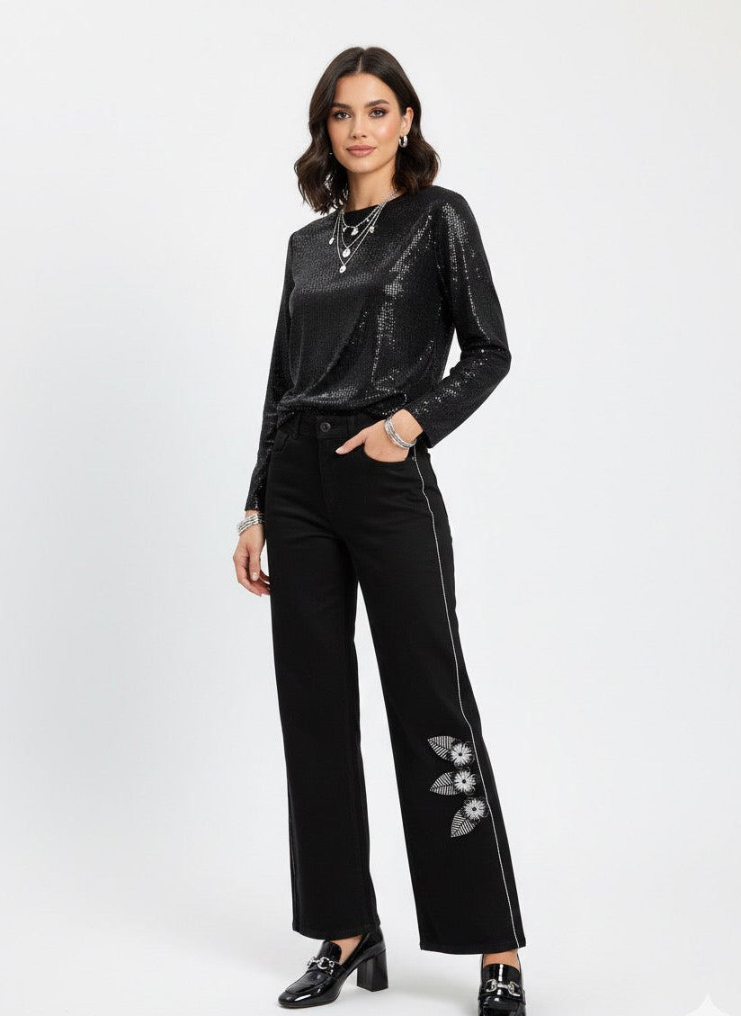 Wear the light. These aren’t just jeans; they are a curated statement of artistry and edge. Set against a deep, midnight-wash denim, a breathtaking cascade of hand-applied gemstones creates a vibrant mosaic down the leg. Each stone is carefully selected to catch and refract light, offering a high-fashion 3D texture that feels both rebellious and refined.